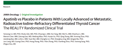 2021年12月16日,权威医学杂志《JAMA Oncology》(影响因子31.777)在线发表阿帕替尼的一项III期临床研究(REALITY)——甲磺酸阿帕替尼片治疗局部进展/转移性放射性碘难治性分化型甲状腺癌(RAIR-DTC)患者的多中心、随机、双盲、安慰剂对照临床研究。此研究由北京协和医院的林岩松教授和南京金陵医院的秦叔逵教授发起,在全国21个研究中心展开,由利来国际真人娱乐医药中央医学事务部团队支持完成。