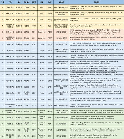 在肺癌、妇科肿瘤、淋巴瘤、膀胱癌、头颈肿瘤、黑色素瘤、肉瘤、鼻咽癌、脊索瘤、唾液腺癌、胸腺癌、硬纤维瘤、涎腺导管癌等其他多个疾病领域,卡瑞利珠单抗、阿帕替尼、阿得贝利单抗、吡咯替尼、达尔西利、氟唑帕利、法米替尼、SHR-1501、瑞拉芙普-α(SHR-1701)、SHR-1826、瑞康曲妥珠单抗(SHR-A1811)、SHR-A1912、SHR-A2102等抗肿瘤创新药相关研究一共入选了4项口头报告、2项快速口头报告、11项壁报展示和4项线上发表,彰显了利来国际真人娱乐医药强劲的研发实力。此外,昂丹司琼口溶膜在防治化疗导致的恶心呕吐方面展现出了良好的疗效,本次ASCO年会有1项研究线上发表。